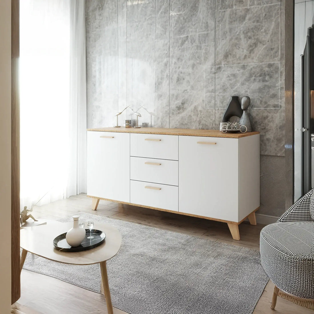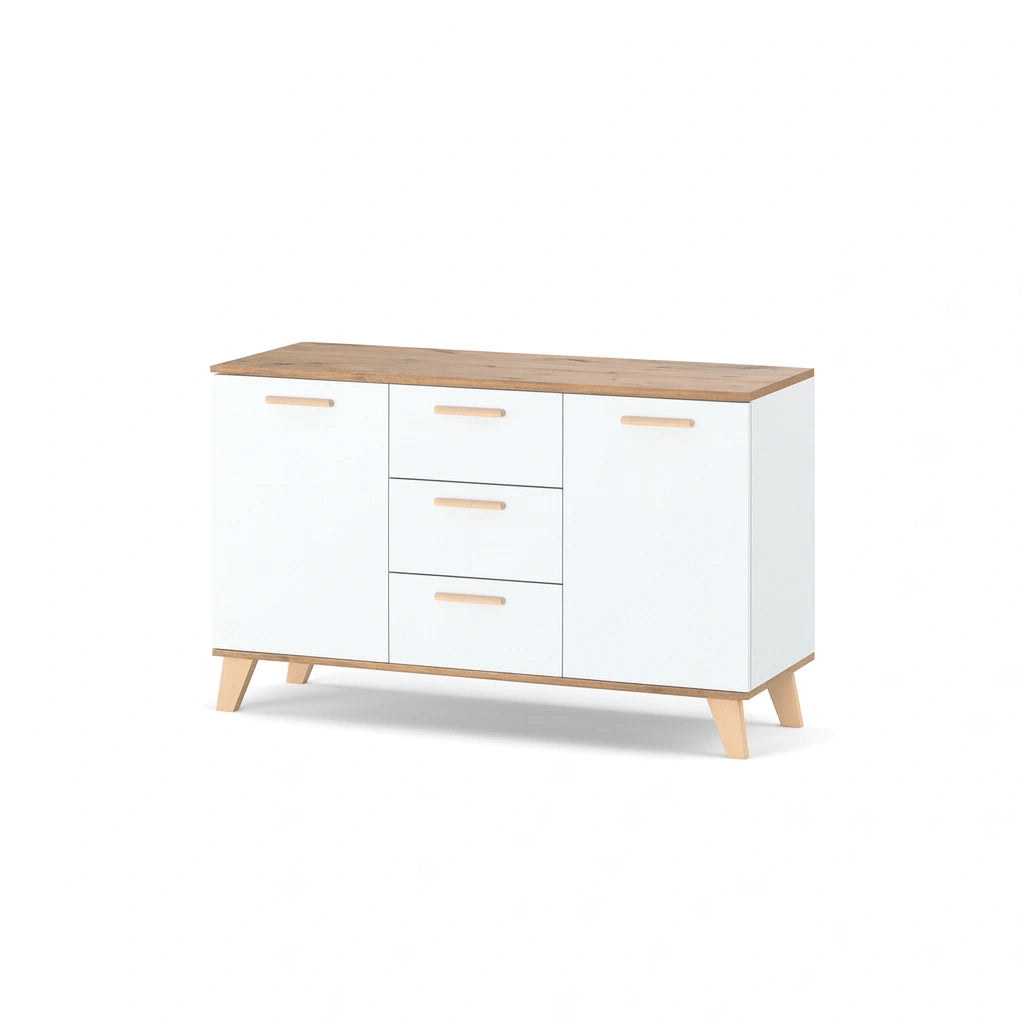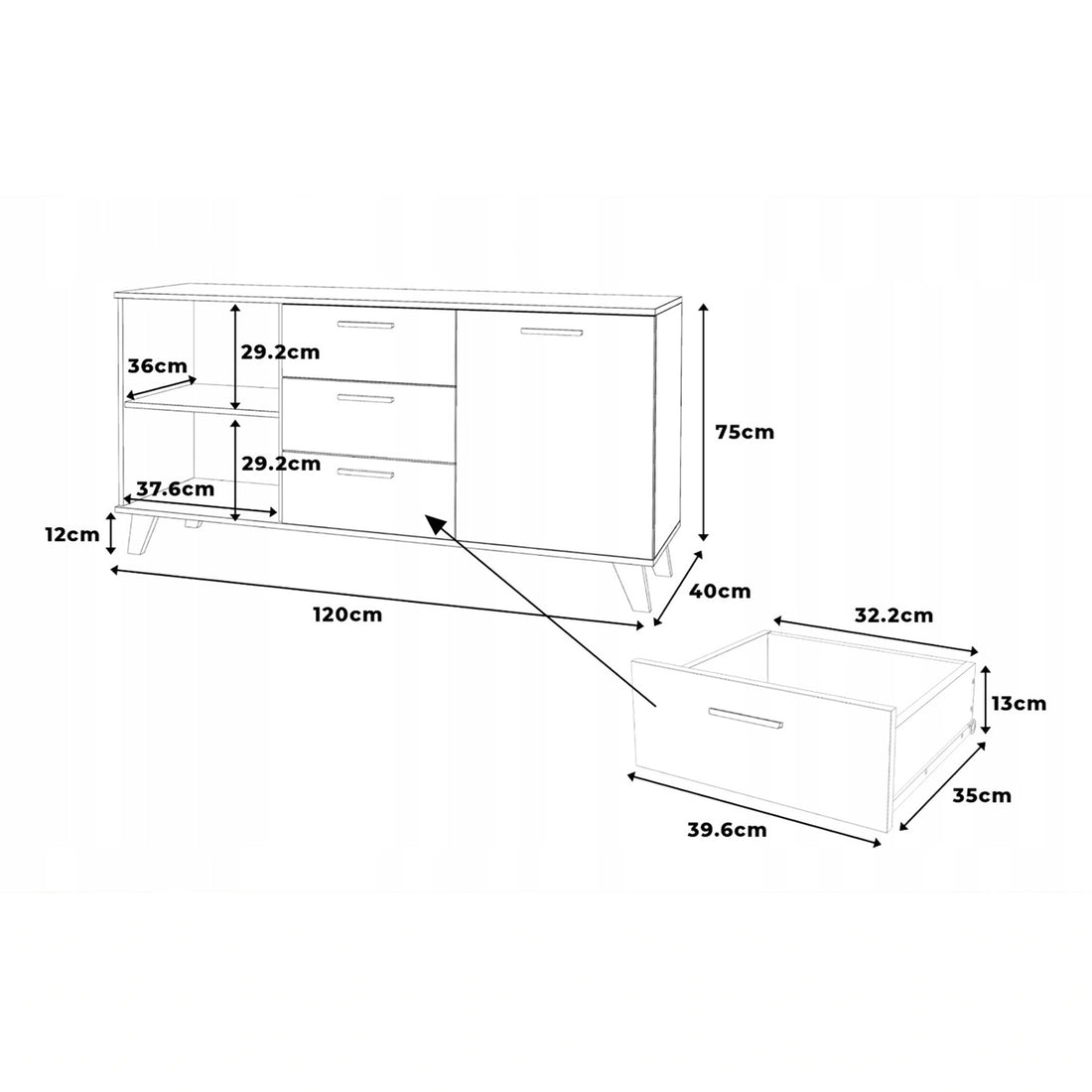 Do tej komody przygotowaliśmy szkic techniczny z dokładnymi wymiarami, opis nóg z litego drewna oraz zestawienie dostępnych kolorów i materiałów, które podkreślą jej charakter.