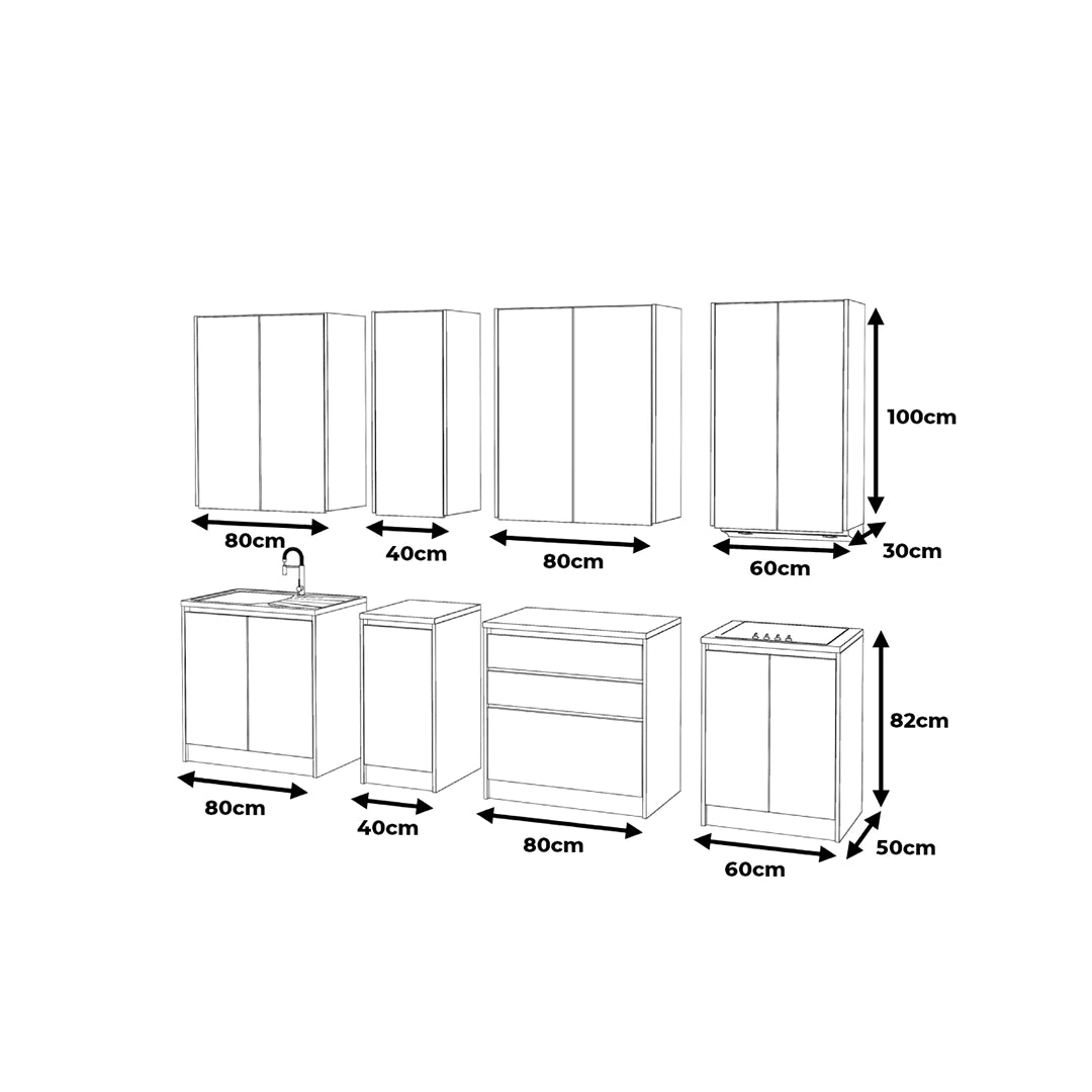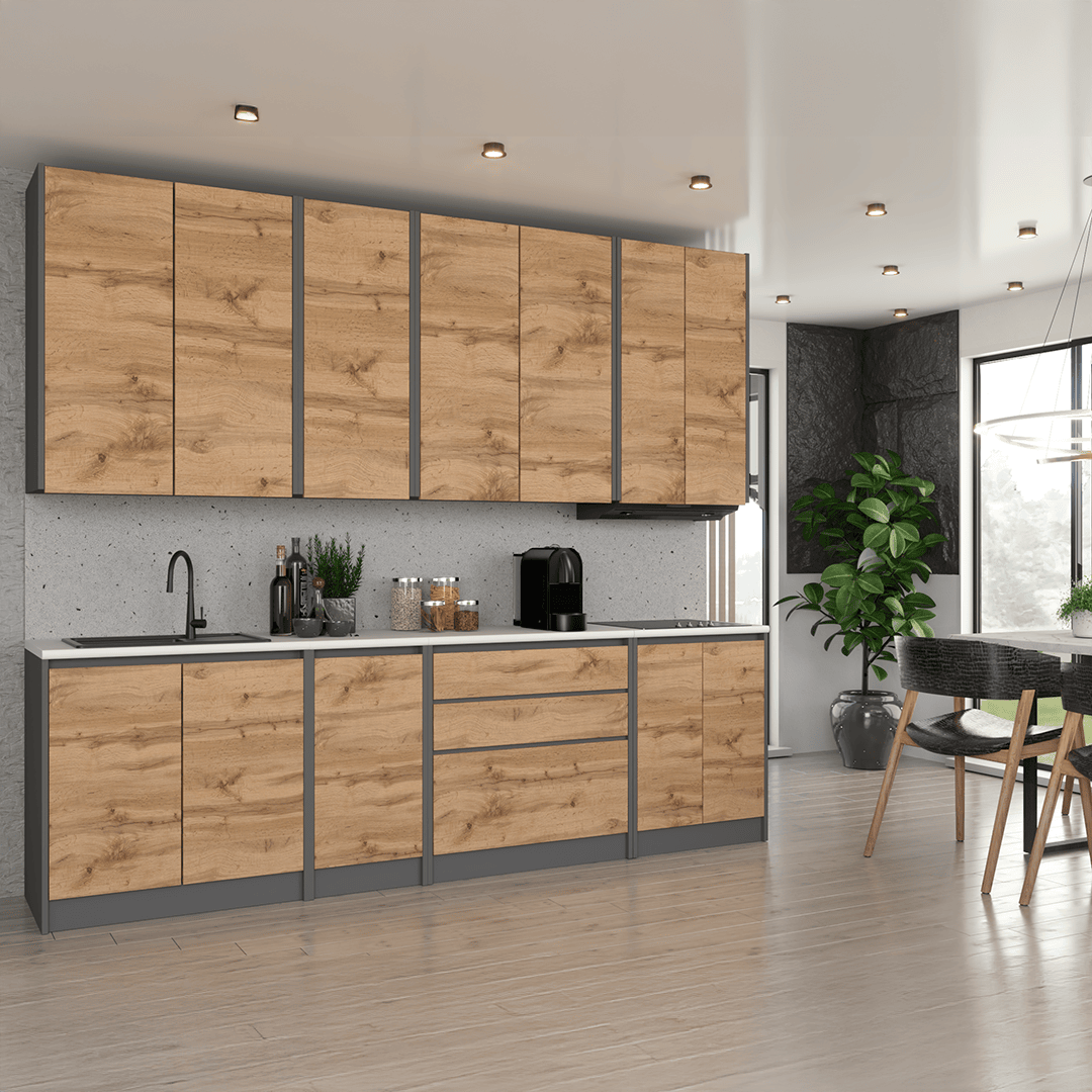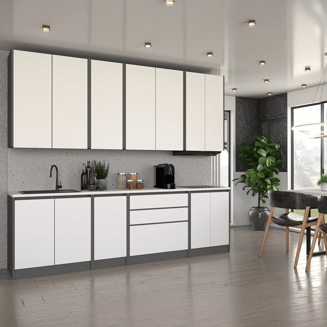 Kuchnia 260 cm to duży, bezuchwytowy zestaw mebli, który łączy nowoczesny wygląd i praktyczność. Wysokie górne szafki, pojemne bryły i solidne wykonanie sprawiają, że gotowanie i przechowywanie stają się wyjątkowo wygodne.