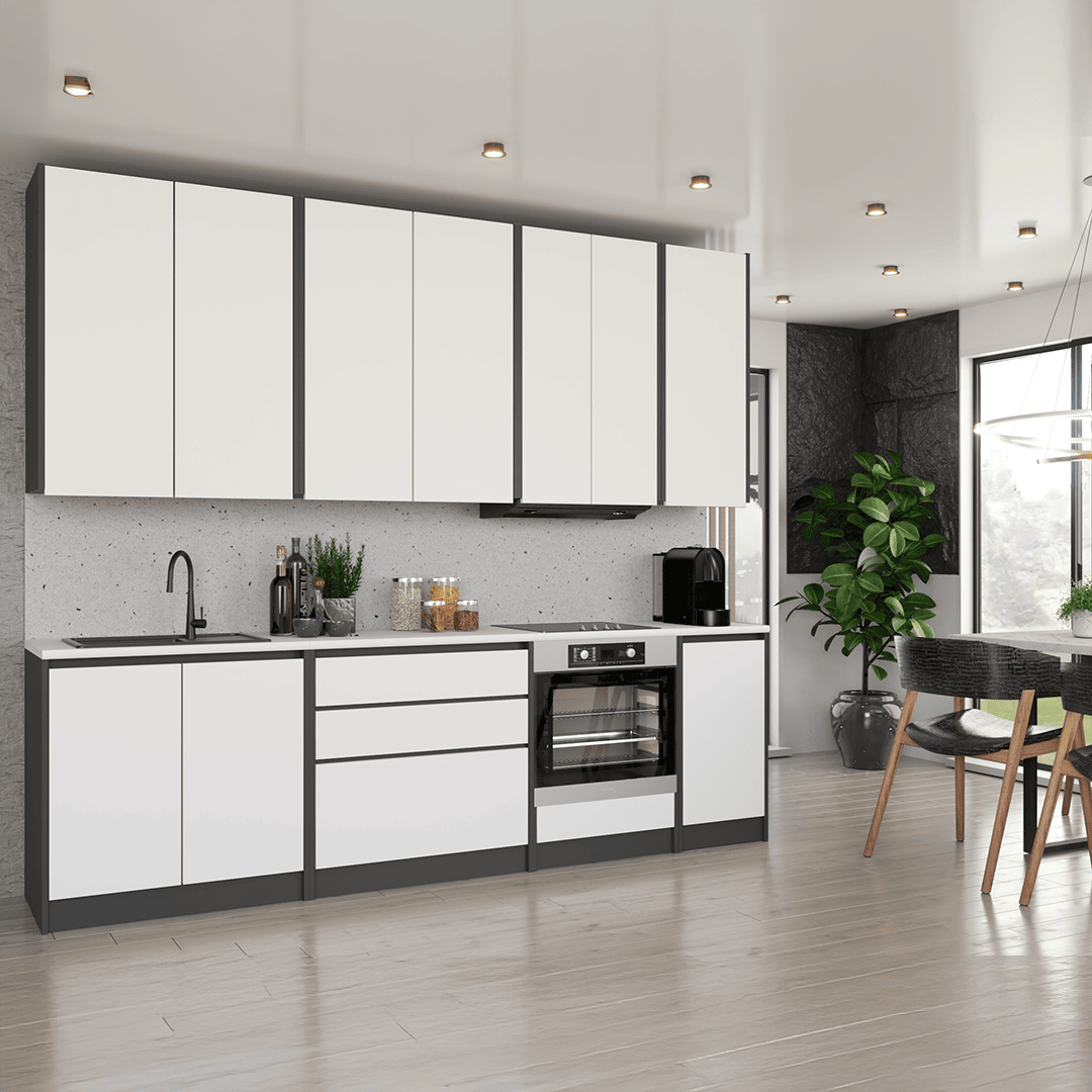 Kuchnia 260 cm to nowoczesny, bezuchwytowy zestaw, który łączy funkcjonalność i estetykę. Wysokie górne szafki, pojemne bryły i modułowa budowa sprawiają, że przestrzeń jest maksymalnie wykorzystana, a codzienne gotowanie wygodne i komfortowe.