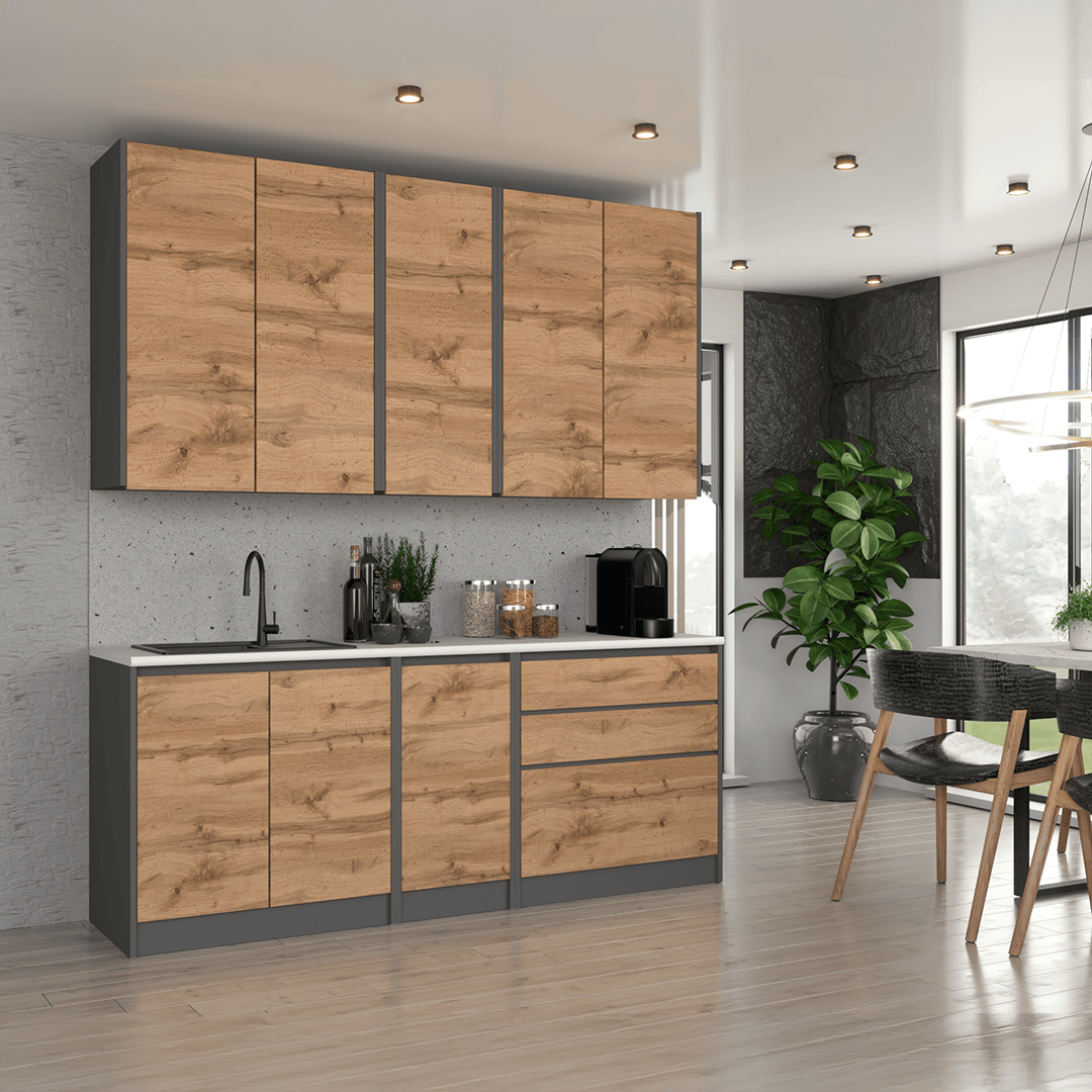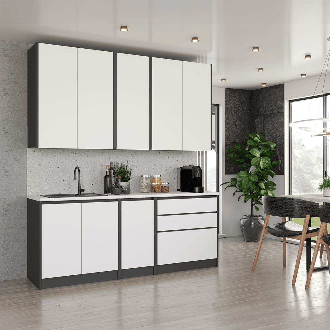 Kuchnia 200 cm to nowoczesny zestaw mebli, który łączy funkcjonalność i minimalistyczny design. Wysokie górne szafki, pojemne bryły i bezuchwytowe fronty wpuszczane sprawiają, że wnętrze zyskuje praktyczność i elegancki charakter.