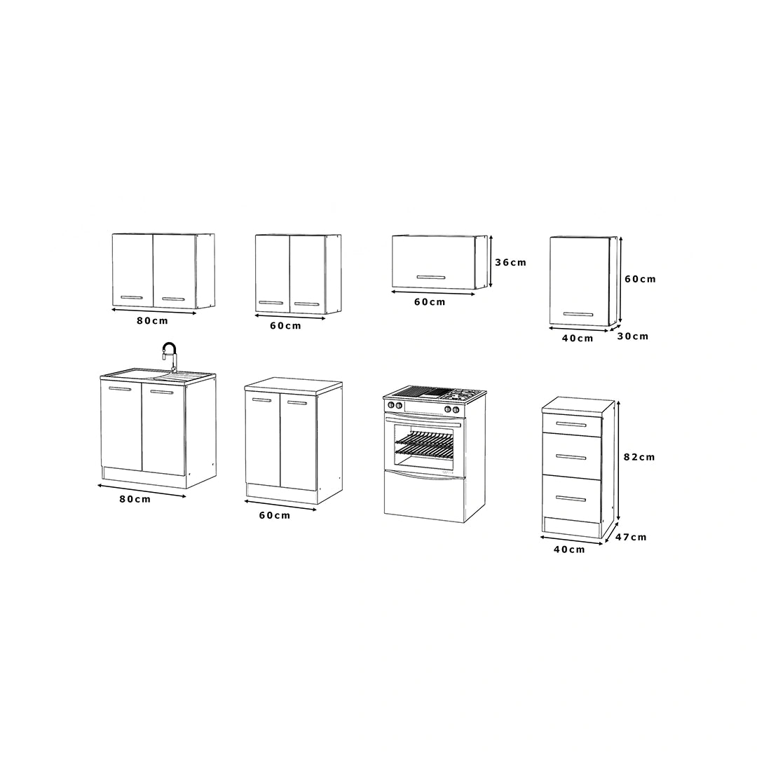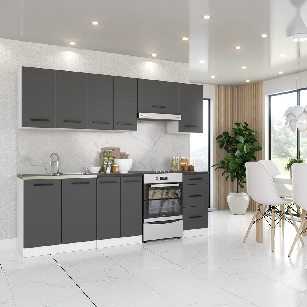 Kuchnia Mango to nowoczesny i funkcjonalny zestaw mebli, który świetnie sprawdzi się w codziennym użytkowaniu. Przemyślany układ szafek i szuflad zapewnia wygodę przechowywania, a prosty, minimalistyczny design pasuje do każdego wnętrza.