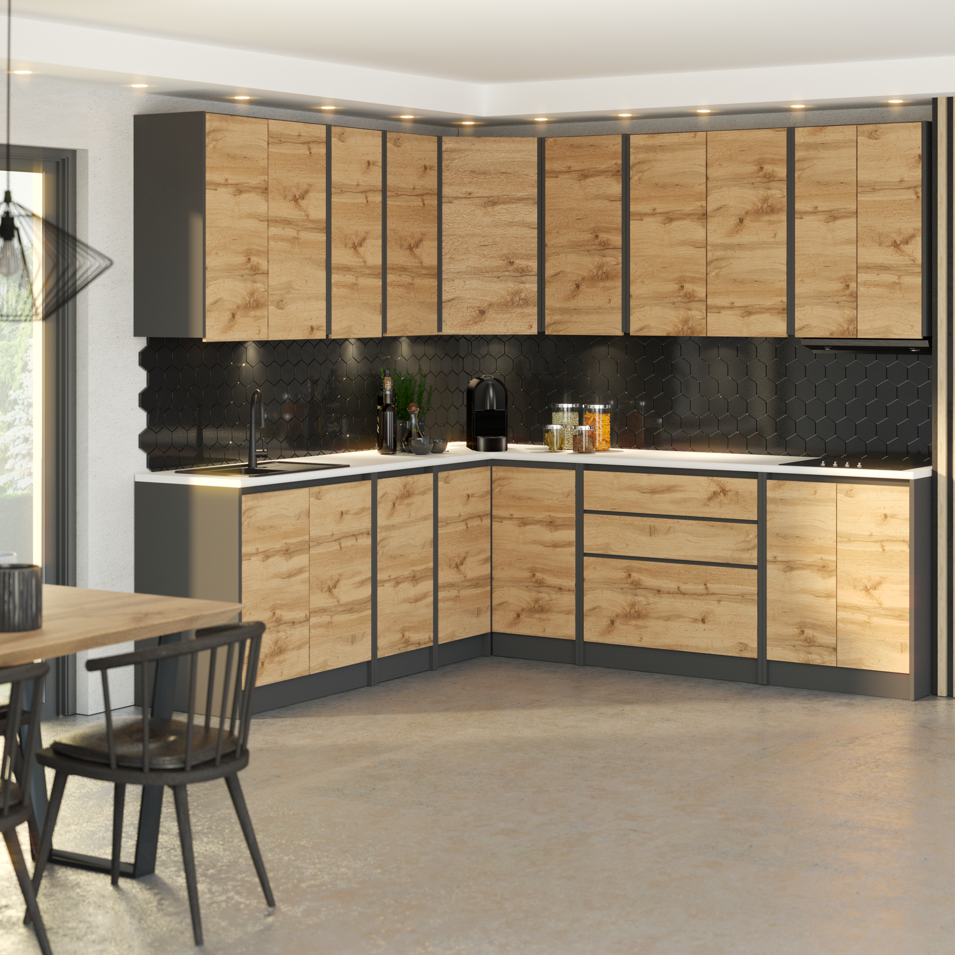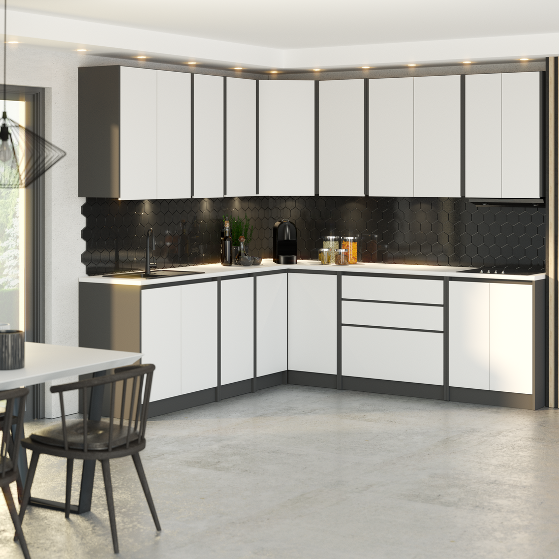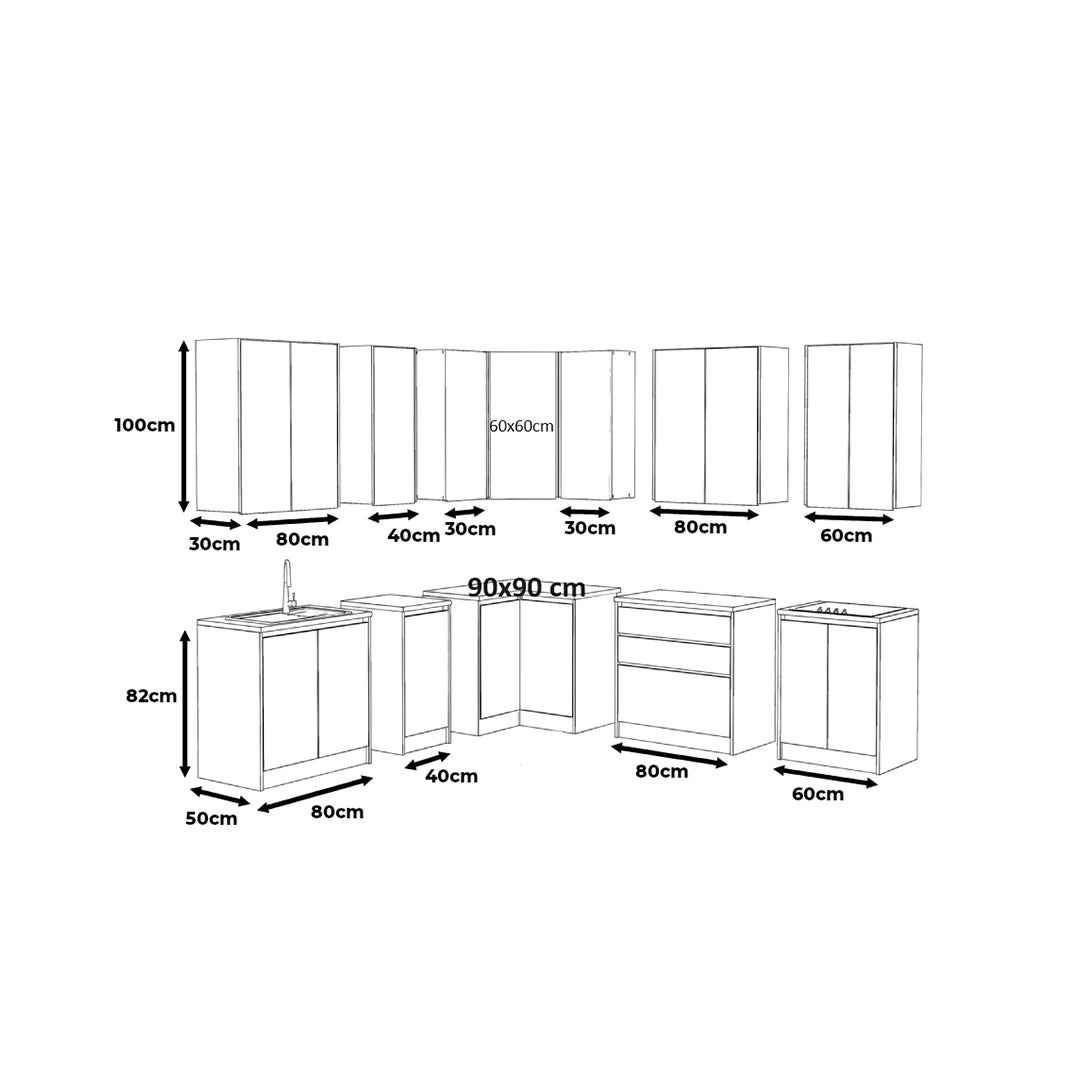Kuchnia narożna to gotowy zestaw mebli modułowych, dzięki którym urządzisz swoją przestrzeń w funkcjonalny i nowoczesny sposób. Przejrzysty szkic z wymiarami, trwała konstrukcja i praktyczne rozwiązania sprawiają, że gotowanie i przechowywanie stają się wygodne i komfortowe.